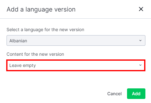 By selecting the „Copy content from another version“ option(1), a new language version will be created as a copy of chosen language version(2). What remains to do is to translate its content into another language.