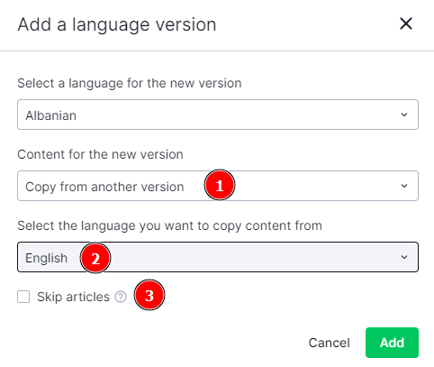 By ticking the box next to „Skip articles“ (3), the new language version will not be created with a copy of all articles created so far in the original language.