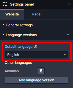 - In order to create an additional language version of a website, go to Settings panel -> Website -> Language version and click „Add languages version„
