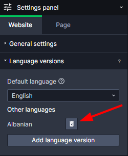 To delete a language version of a website, go to the „Default language“ tab and click „bin“ button, next to the chosen language. If you delete a default language, another one will automatically replace it.