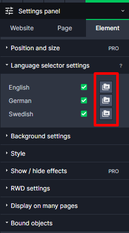 Enter languages menu and in the Settings Panel go to „Language selector settings“. Choose the languages (from your created versions of your website) that should be displayed in the menu. You can also change the thumbnails of the selected languages.