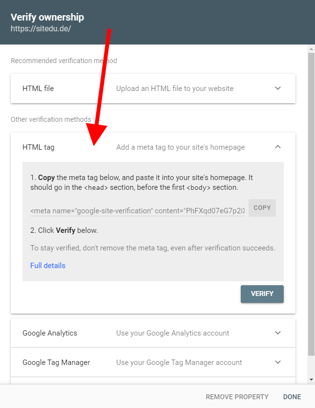 3. In the next step choose „HMTL tag“ as verification method and copy the code generated by Google. Having it on your website will help to verify the ownership of your website and monitor the statistics.