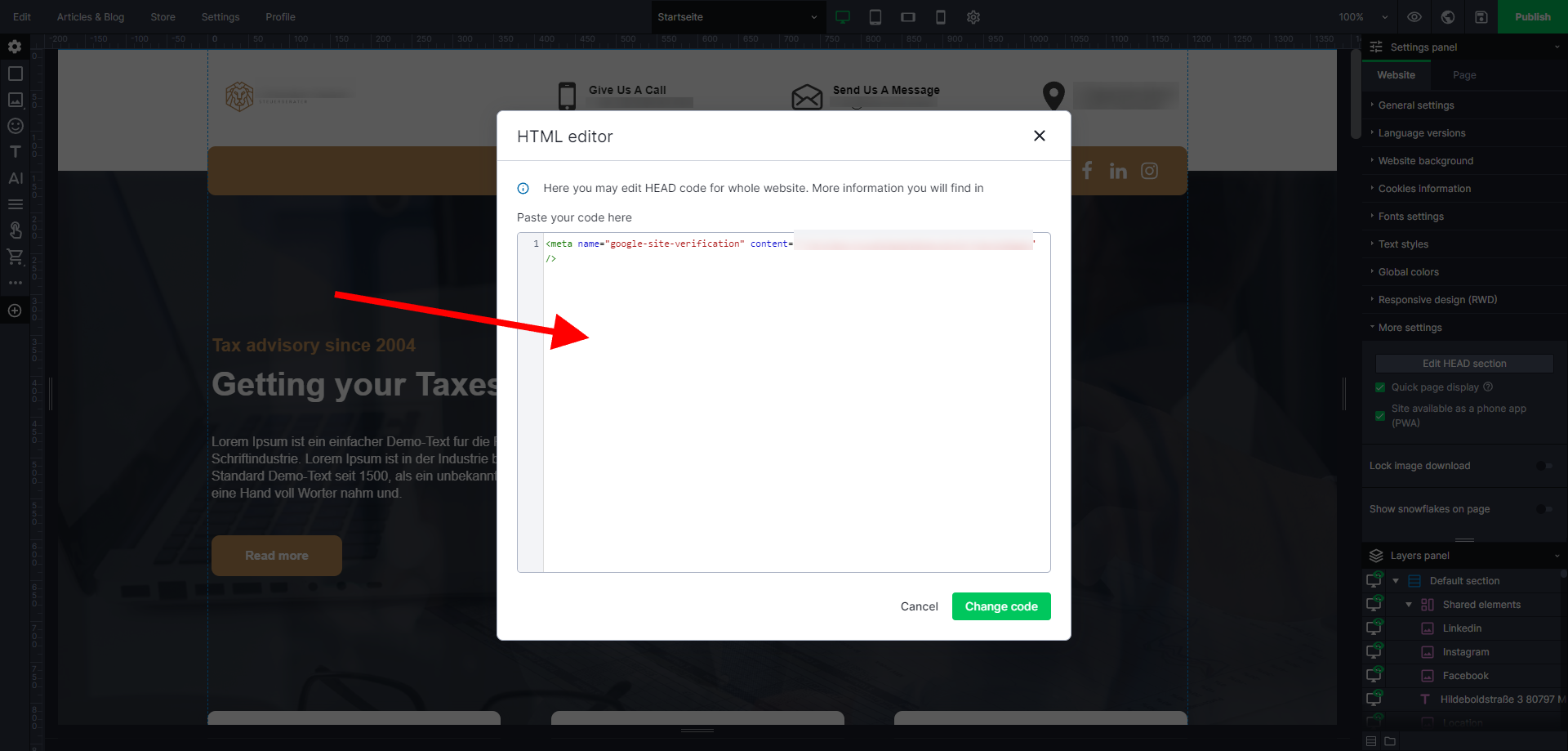 4. Now, head over to your head section in the SiteDu.de builder. You find it in the Settings Panel in the „Website“ tab under „More Settings“. Click here on „Edit Head Section“ and paste the Google code. Don´t forget to publish your website.