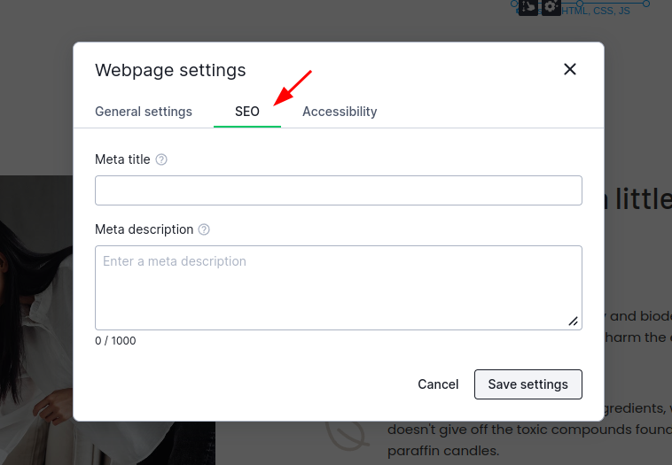 In the Settings Panel, you can set default meta tags for your subpages separately from meta title. Default meta tags are a title and a description which will be displayed if meta tags of a particular subpage haven’t been set yet. Of course, it is better each subpage has its own title and description. Set meta tags separately in the Settings Panel in „Page“.